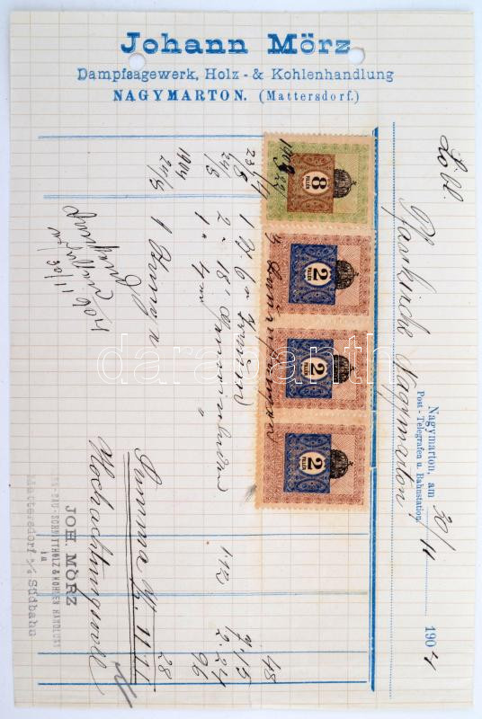 1904 Nagymartoni templomszámadáshoz számla 3x2f + 8f számlailletékkel https://www.darabanth.com/de/253-Fernauktion/253.0/Andere-Sammelgebiete/Stempelmarken~400029/1904-Nagymartoni-templomszamadashoz-szamla-3x2f-plus-8f-szamlailletekkel~II1229791