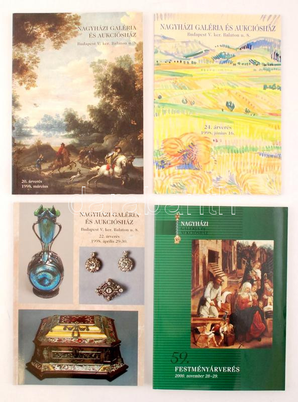 Beschreibung: 1998-2000 A Nagyházi Galéria és Aukciósház 20., 22., 24. és 59. árverésének képekkel gazdagon illusztrált katalógusai, 4 db, papírkötésben, jó állapotban.