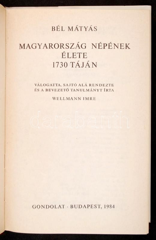 Bél Mátyás: Magyarország népének élete 1730 táján. Bp., 1984, Gondolat... https://www.darabanth.com/de/253-Fernauktion/253.0/Bucher-Landkarten-Drucksachen/Bucher-Geschichte~400011/Bel-Matyas-Magyarorszag-nepenek-elete-1730-tajan-Bp-1984-Gondolat-Kiadoi-vaszonkot~II1231045