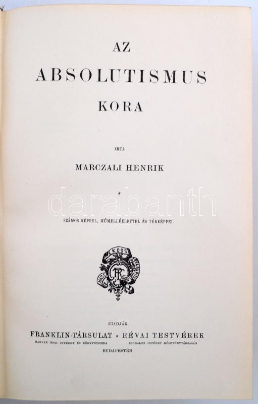 Marczali Henrik: Az abszolutizmus kora. Nagy Képes Világtörténet IX. kötet. Bp., Franklin-Társulat, Révai Testvérek. Kiadói aranyozott félbőr kötés, festett lapszélek, kissé kopott állapotban.