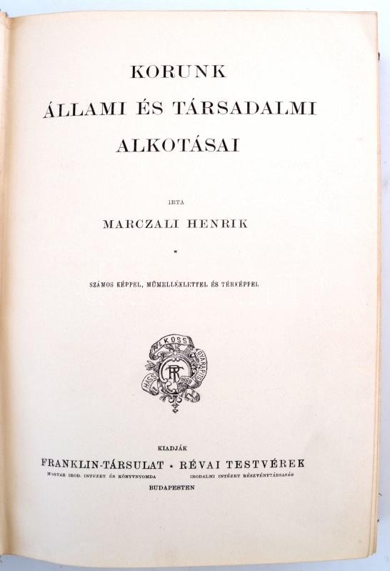 Marczali Henrik: Korunk állami és társadalmi alkotásai. Nagy Képes Világtörténet XII. kötet. Bp., Franklin-Társulat, Révai Testvérek. Kiadói aranyozott félbőr kötés, festett lapszélek, kissé kopott állapotban.