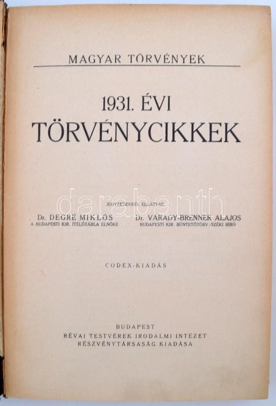 1931. évi törvénycikkek. Magyar törvények. Jegyzetekkel ellátták Dr. Degré Miklós, Dr. Várady-Brenner Alajos. Bp., Révai Testvérek. Egészvászon kötés, belül a gerincnél kissé levált, kopottas állapotban.