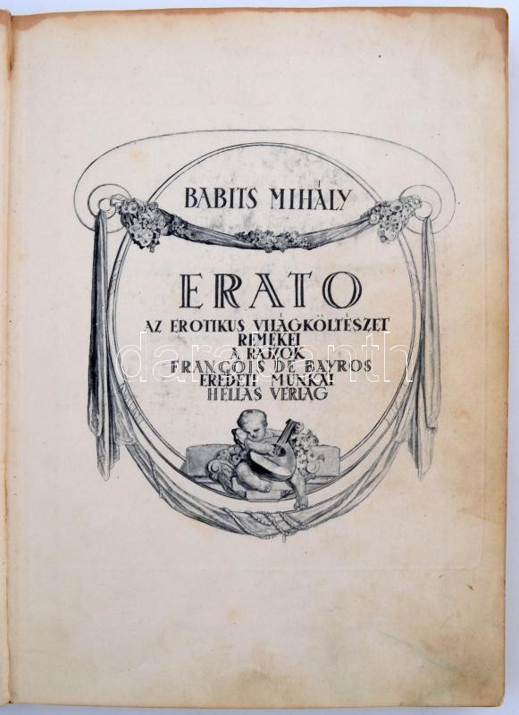 Babits Mihály: Erato. Az erotikus világköltészet remekei. A rajzok Francois de Bayros eredeti munkái. Első kiadás! Bécs, (1921) Hellas. Forgalomba nem került, számozott 103/500 példány! A pesti hatóságok később erkölcstelenség vádjával a kötetet elkobozták. Kopottas fedőborítóval, néhány lap kissé foltos. Kiadói félvászon kötésben.