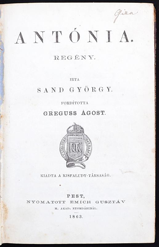Sand György [George]: Antónia. Regény. Pest, 1863, Kisfaludy Társaság.... https://www.darabanth.com/de/253-Fernauktion/253.0/Bucher-Landkarten-Drucksachen/Bucher-Sonstige-Raritaten~400032/Sand-Gyorgy-George-Antonia-Regeny-Pest-1863-Kisfaludy-Tarsasag-Kopott-felbor-kotesb~II1224991