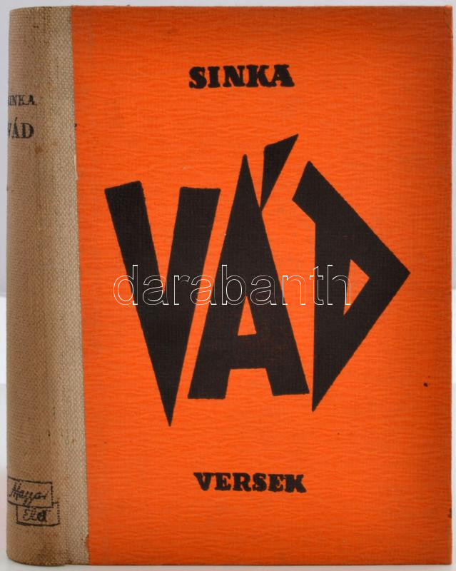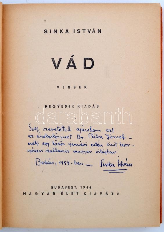 Sinka István: Vád. Versek. DEDIKÁLT! Bp., 1944, Magyar Élet Kiadása. Kiadói félvászon kötés, belül a gerincnél teljesen levált, egyébként jó állapotban.