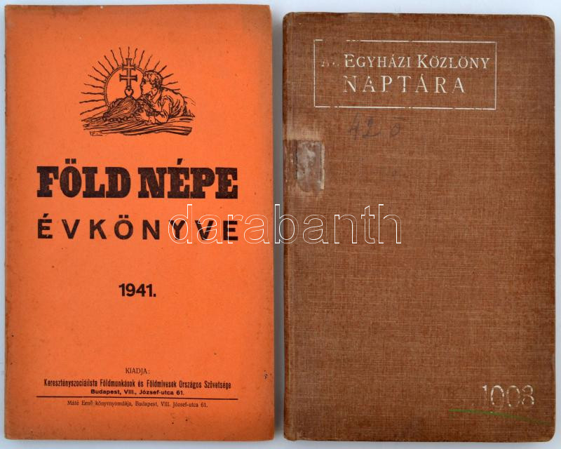 1903-41 Az egyházi közlöny naptára, pp.:272, 22x15cm+ Föld népe évköny... https://www.darabanth.com/de/253-Fernauktion/253.0/Bucher-Landkarten-Drucksachen/Drucksachen~400042/1903-41-Az-egyhazi-kozlony-naptara-pp272-22x15cmplus-Fold-nepe-evkonyve-1941-pp128-23x~II1226970