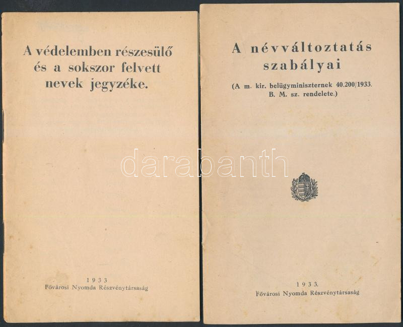 1933 A védelemben részesülő és sokszor felvett nevek jegyzéke. 40p. + ... https://www.darabanth.com/de/253-Fernauktion/253.0/Bucher-Landkarten-Drucksachen/Drucksachen~400042/1933-A-vedelemben-reszesulo-es-sokszor-felvett-nevek-jegyzeke-40p-plus-1933-A-Nevvaltozas-sz~II1230998