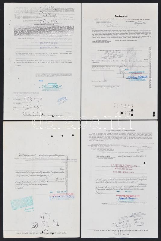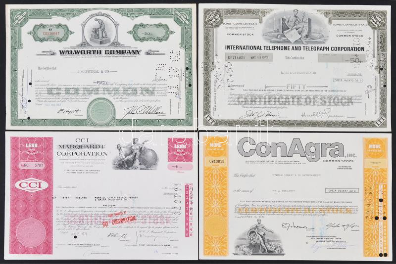 Amerikai Egyesült Államok 1962-1982. 4db klf részvény, közte Delaware 1973. "International Telephone and Telegraph Corporation" részvényelismervénye 50 részvényről, egyenként 1$-ról, perforált és lyukasztott, Massachusetts 1962. "Walworth Company" részvényelismervénye 50 részvényről, egyenként 2,5$ értékben, perforált és lyukasztott T:I-,II,III USA 1962-1982. 4pcs of diff shares, including Delaware 1973. "International Telephone and Telegraph Corporation" certificate about 50 shares, each with the par value of 1 Dollar, perforated and with holes, Massachusetts 1962. "Walworth Company" certificate about 50 shares, each with the par value of 2,5 Dollars, perforated and with holes C:AU,XF,F