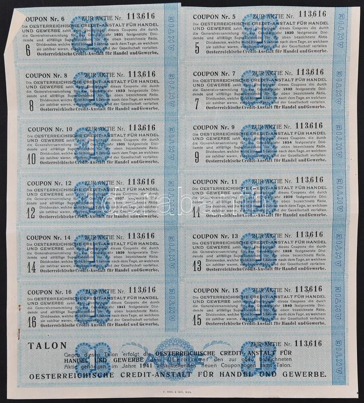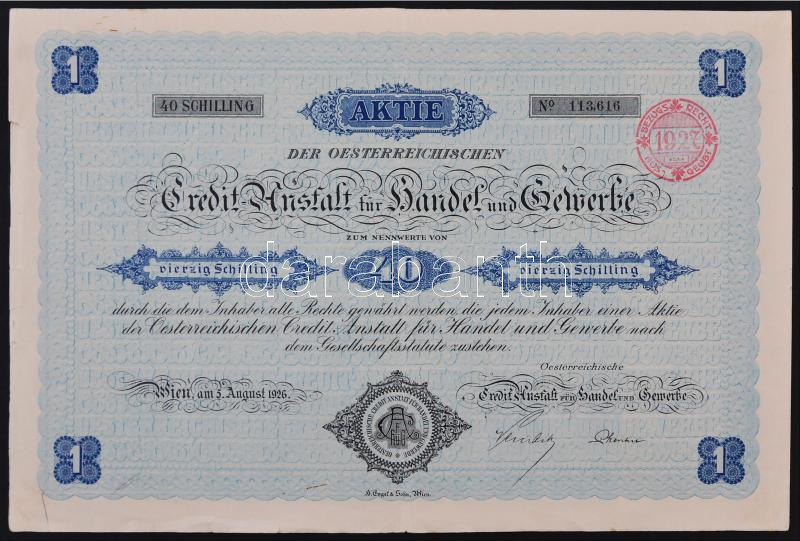 Austria / Vienna 1926. "Oesterreichischen Credit-Anstalt für Handel und Gewerbe (Austrian Credit-Institute for Commerce and Industry)" share about 40 Schilling, with coupons and overprint C:F