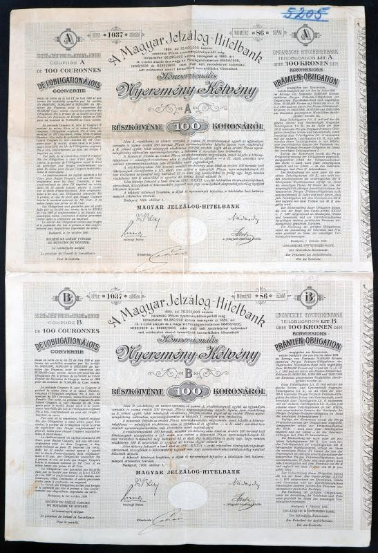 Beschreibung: Budapest 1906. "Magyar Jelzálog - Hitelbank Nyeremény - Kötvény" "A" és "B" részkötvénye 100K-ról egy ívben, 3 nyelven, szárazpecséttel T:II-