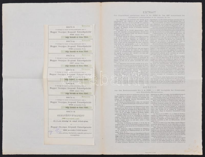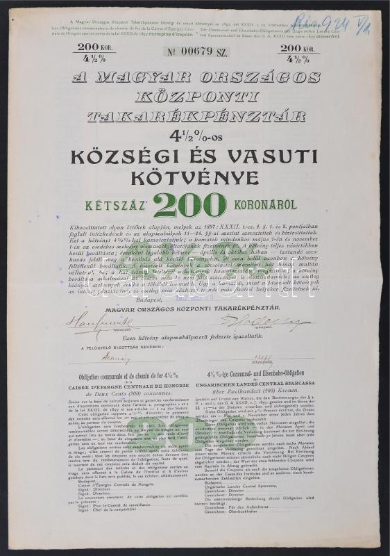 Beschreibung: Budapest 1917. "A Magyar Országos Központi Takarékpénztár" 4 1/2%-os községi és vasúti kötvénye 200K-ról szelvényekkel T:II-