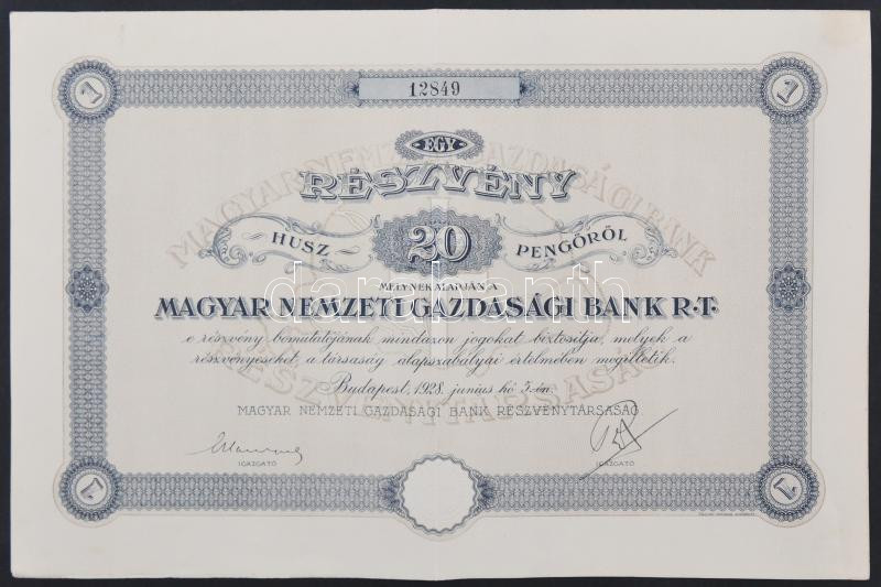 Budapest 1928. "Magyar Nemzeti Gazdasági Bank Rt." részvénye... https://www.darabanth.com/de/253-Fernauktion/253.0/Numismatik/Aktien-und-Tickets~200005/Budapest-1928-Magyar-Nemzeti-Gazdasagi-Bank-Rt-reszvenye-20P-rol-TII-~II1225099