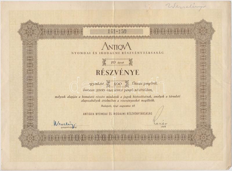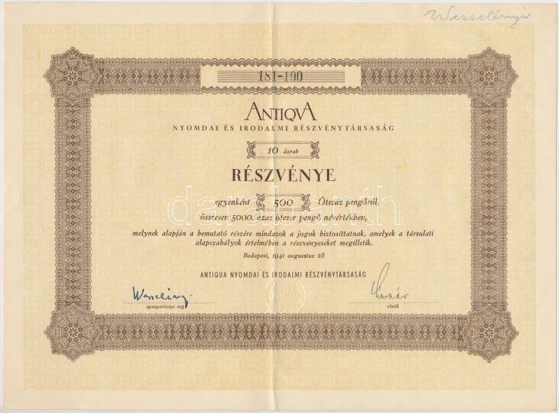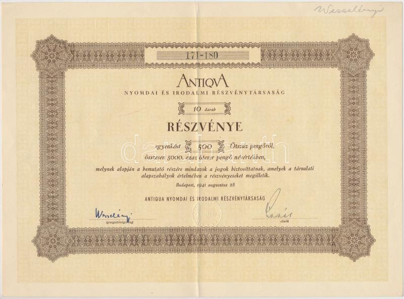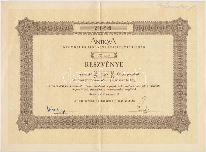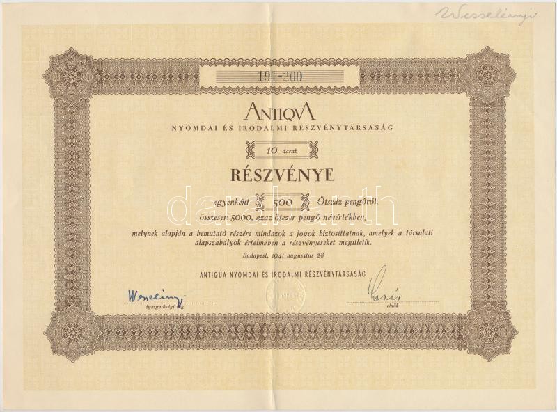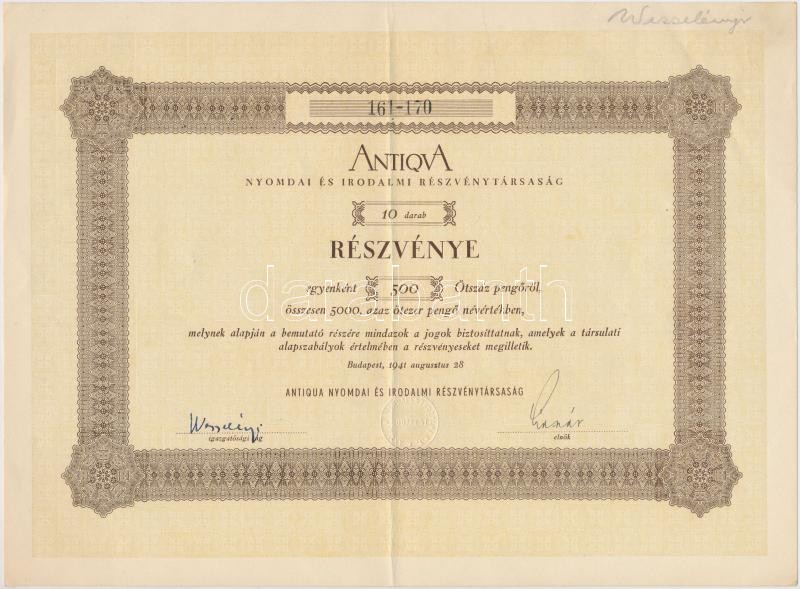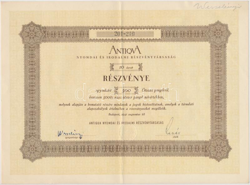 Budapest 1941. "Antiqua Nyomdai és Irodalmi Részvénytársaság"... https://www.darabanth.com/de/253-Fernauktion/253.0/Numismatik/Aktien-und-Tickets~200005/Budapest-1941-Antiqua-Nyomdai-es-Irodalmi-Reszvenytarsasag-10db-reszvenye-egyenkent-500P-~II1226921