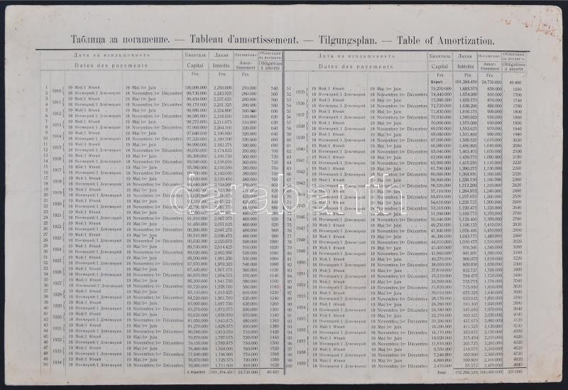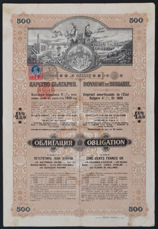 Bulgária 1909. "4 1/2%-kal kamatozó állami arany kölcsön kötvény" 500 arany Fr-ról, szelvényekkel, felülbélyegzésekkel T:III