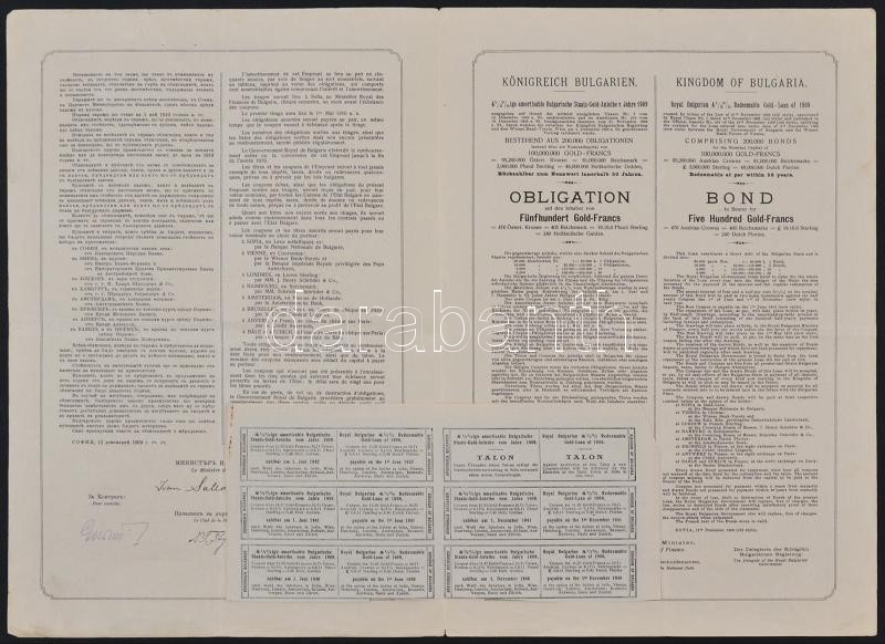 Bulgaria 1909. "Royal Bulgarian 4 1/2% redeemable gold loan" bond to bearer for 500 gold Francs, with coupons and overprints C:F