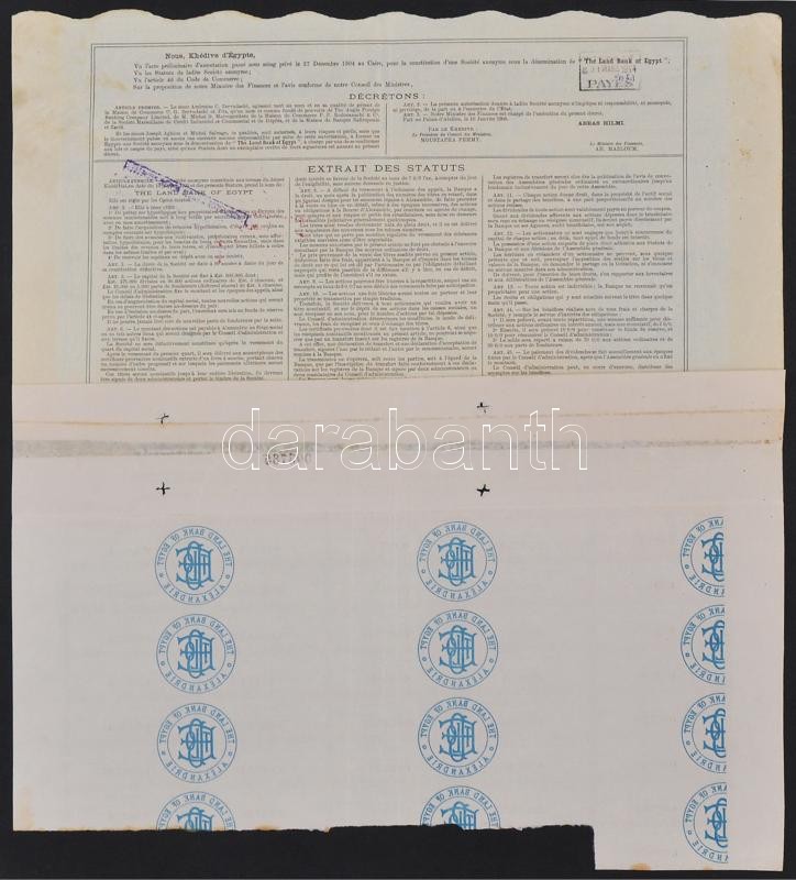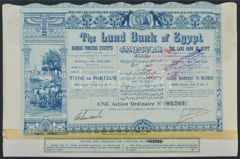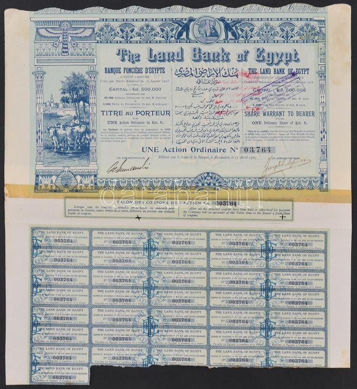 Egypt/Alexandria 1905. "The Land Bank of Egypt" share about 5 Pounds, with coupons, overprint and embossed stamp C:F glued