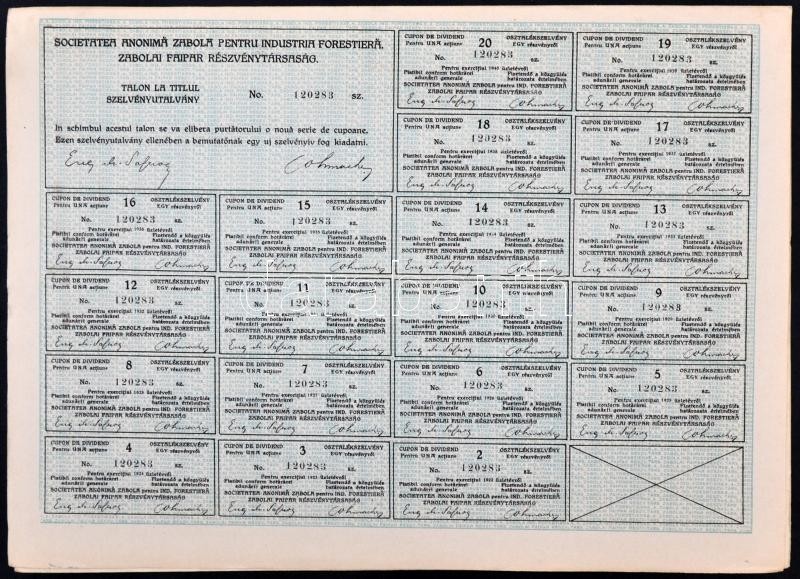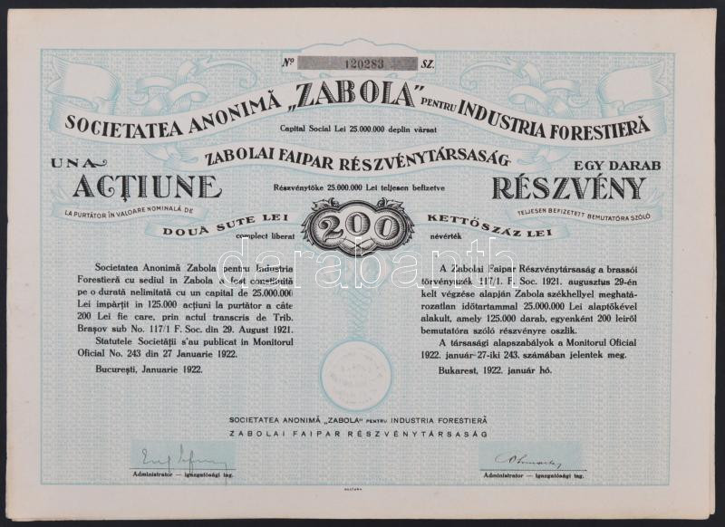 Románia / Bukarest 1922. "Zabolai Faipar Részvénytársaság" részvénye 200L-ről teljes szelvényívvel T:I-