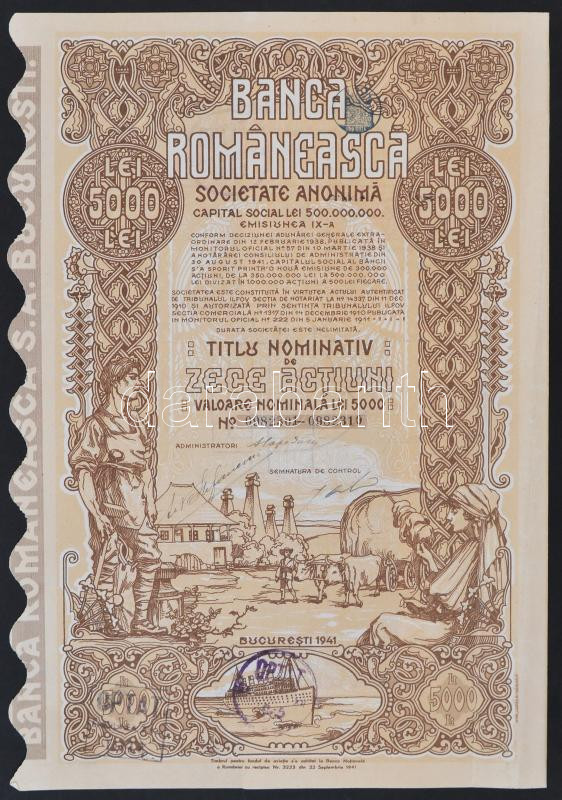Romania / Bucharest 1941. "Romanian Bank" 10 shares, each withe the par value of 5000 Lei, with coupons, overprint and embossed stamp C:VF,F