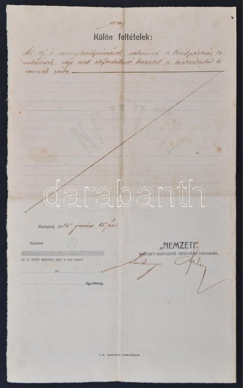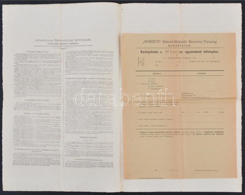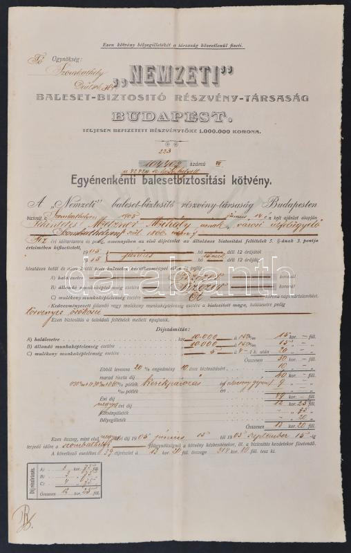 Beschreibung: Szombathely 1905. "Nemzeti Baleset-Biztosító Részvény-Társaság Budapest" kötvénye 514K-ról és 80f-ről, kárbejelentés nyomtatvánnyal T:III