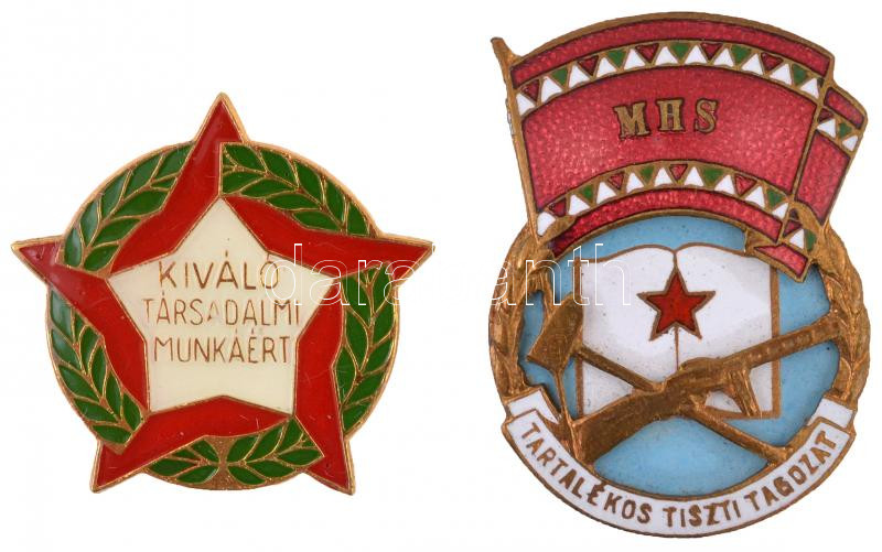 Beschreibung: ~1970. "MHS Tartalékos Tiszti Tagozat" zománcozott fém jelvény eredeti tokban (41x29mm) + "Kiváló társadalmi munkáért" zománcozott fém jelvény eredeti tokban (33mm) T:2,1