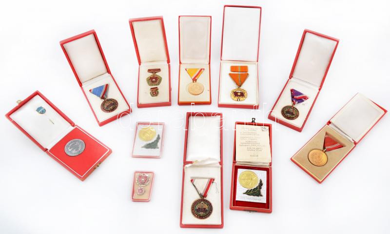 11db vegyes szocialista kitüntetés, emlékérem, jelvény, mind saját tokokban, közte "Gyógyszerkutató Intézet 10 éves Törzsgárda" fém emlékérem (41mm), 1978. "Vasutasnap" Al plakett eredeti tokban T:vegyes
