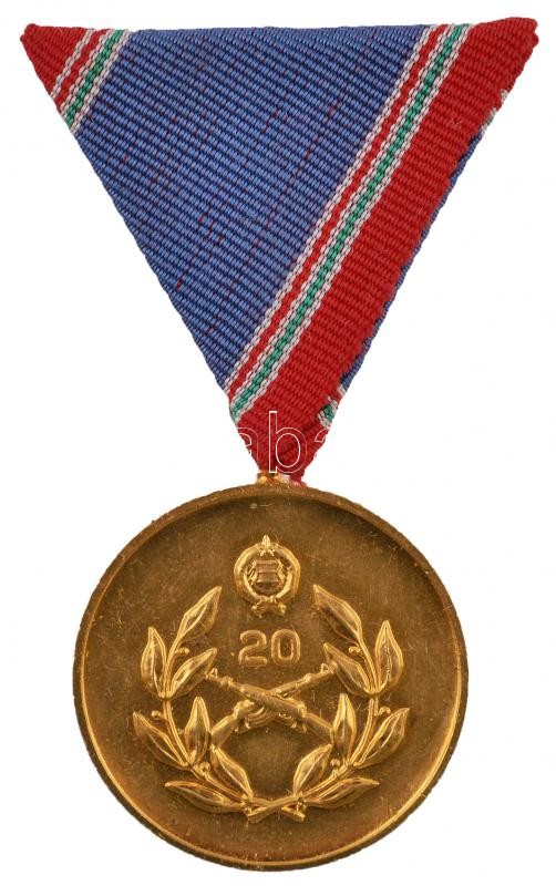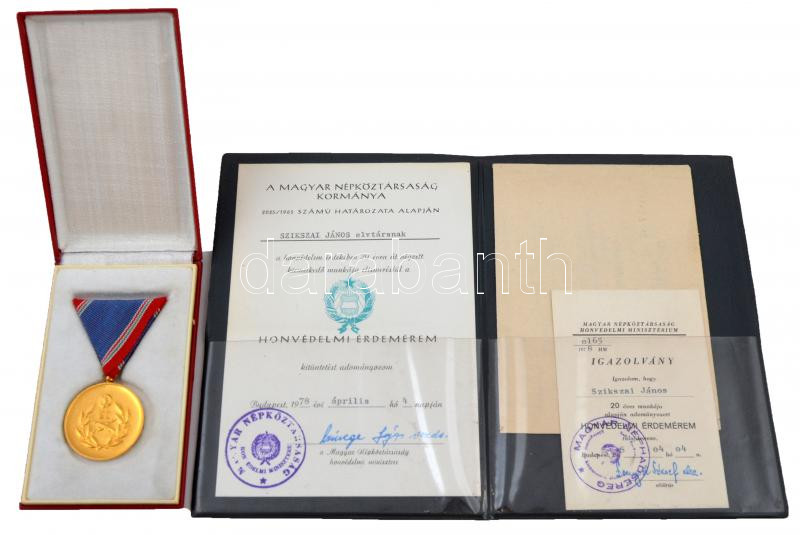 Beschreibung: 1978. "Honvédelmi Érdemérem" 20 év után, aranyozott fém kitüntetés mellszalaggal, tokban, adományozói okirattal és igazolvánnyal T:2