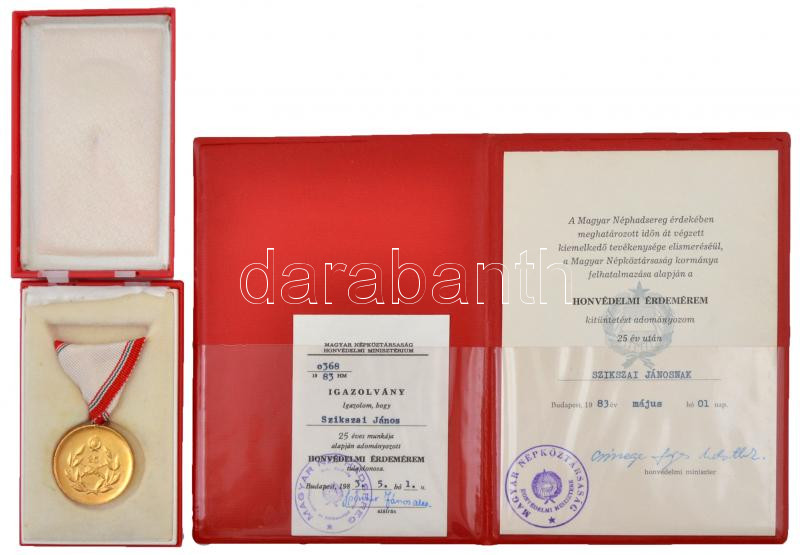 1983. "Honvédelmi Érdemérem" 25 év után, aranyozott fém kitü... https://www.darabanth.com/de/253-Fernauktion/253.0/Numismatik/Militaria~200015/1983-Honvedelmi-Erdemerem-25-ev-utan-aranyozott-fem-kituntetes-mellszalaggal-tokban-ad~II1223845