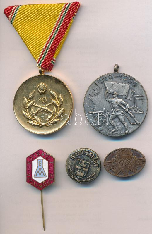 Beschreibung: 5db-os kitüntetés, jelvény és kitűző tétel, közte 1959. "Tanácsköztársasági Emlékérem" ezüstözött Br érem mellszalag nélkül (38mm), DN "Budapestért" Br jelvény, "Egyesült Vegyiművek" zománcozott fém kitűző T:2,2-