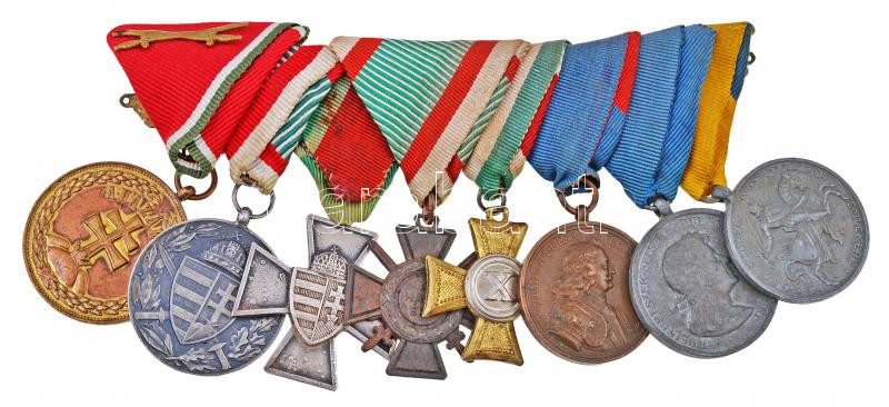 8db kitüntetés pánton összefűzve: 1922. "Magyar Bronz Érdemérem" aranyozott Br kitüntetés modern mellszalaggal + 1929. "Magyar Háborús Emlékérem kardokkal, sisakkal" ezüstözött Br kitüntetés modern mellszalaggal + 1940. "Nemzetvédelmi Kereszt / A Hazáért" kitüntetés mellszalaggal + 1942. "Tűzkereszt I. fokozata" kitüntetés mellszalaggal + 1923. "II. osztályú Legénységi Szolgálati Jel" kitüntetés mellszalaggal + 1938. "Felvidék felszabadítása - II. Rákóczi Ferenc" Br emlékérem mellszalaggal + 1940. "Erdélyi részek felszabadulásának emlékére" cink emlékérem mellszalaggal. Szign.:BERÁN + 1941. "Délvidéki Emlékérem" cink emlékérem mellszalaggal. Szign.: BERÁN L. T:2,2- 8pcs of concatenated Hungarian decorations: 1922. "Hungarian Bronze Merit Medal" gold plated Br decoration with modern ribbon + 1929. "Hungarian Commemorative War Medal with swords and a helmet" silver plated Br decoration with modern ribbon + 1940. "National Defense Cross" with ribbon + 1942. "Hungarian Fire Cross 1st class" decoration with ribbon + 1923. "Distinction for Long Service for the Soldiers, 2nd Class" decoration with ribbon + 1938. "Liberation of Upper Hungary / Francis II Rákóczi" Br medal with ribbon + 1940. "Commemorative Medal for the Liberation of Transylvania" zinc medal with original ribbon. Sign.:BERÁN L. + 1941. "Commemorative Medal for the Return of Southern Hungary" zinc medal with original ribbon. Sign.:BERÁN L. C:XF,VF