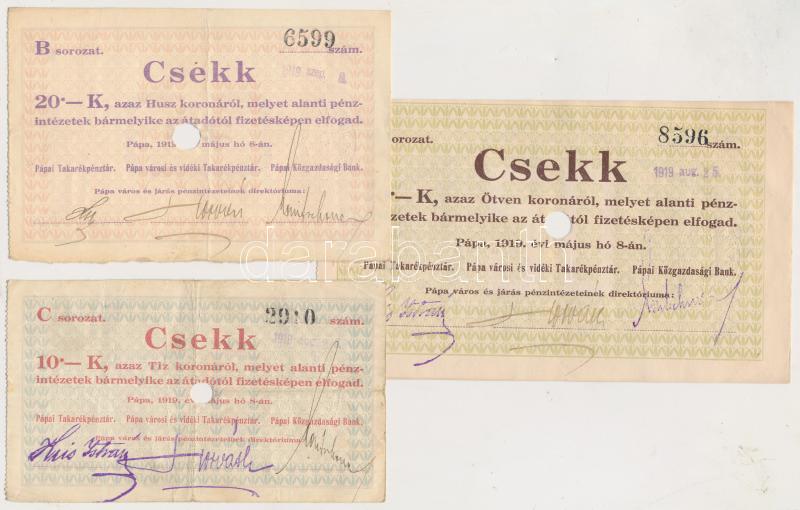 Pápa 1919. május 8. "Pápai csekk" 10K + 20K + 50K mind lyuka... https://www.darabanth.com/de/253-Fernauktion/253.0/Numismatik/Notgelden~200006/Papa-1919-majus-8-Papai-csekk-10K-plus-20K-plus-50K-mind-lyukasztassal-ervenytelenitve-es-ova~II1223610