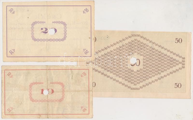 Beschreibung: Pápa 1919. május 8. "Pápai csekk" 10K + 20K + 50K mind lyukasztással érvénytelenítve és ovális szárazbélyegzővel T:I-,III