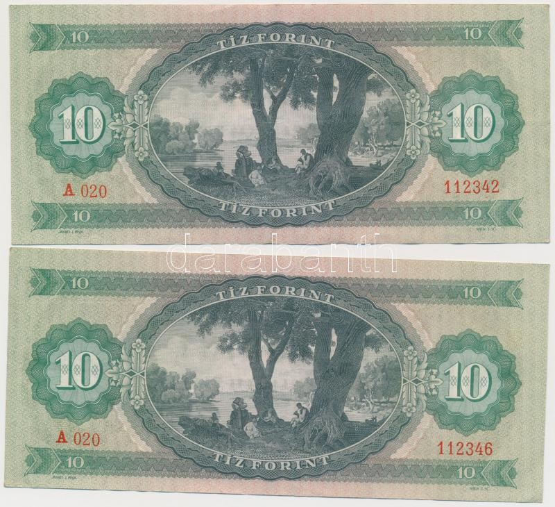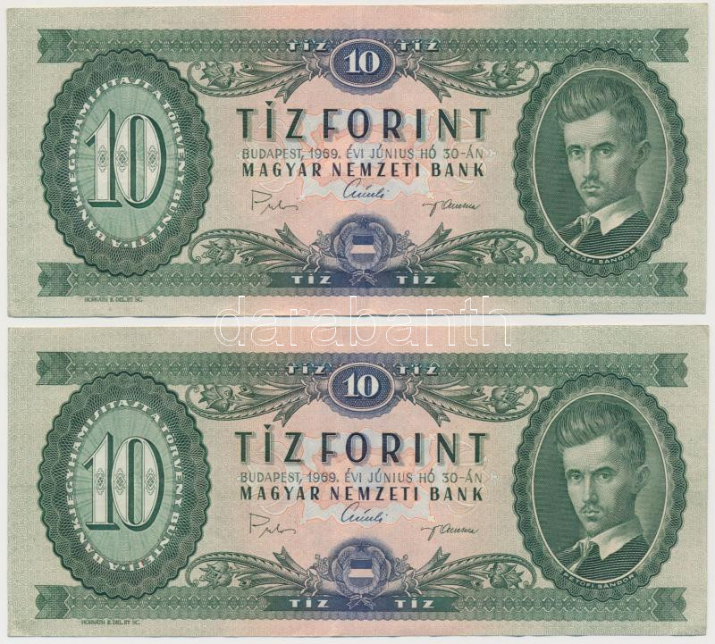 1969. 10Ft (2x) közeli sorszámmal T:III szép papír https://www.darabanth.com/de/253-Fernauktion/253.0/Numismatik/Ungarische-Banknoten~200007/1969-10Ft-2x-kozeli-sorszammal-TIII-szep-papir~II1225005