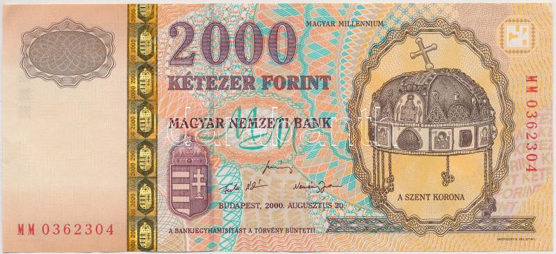 2000. 2000Ft "Millennium" T:II- https://www.darabanth.com/de/253-Fernauktion/253.0/Numismatik/Ungarische-Banknoten~200007/2000-2000Ft-Millennium-TII-~II1230933