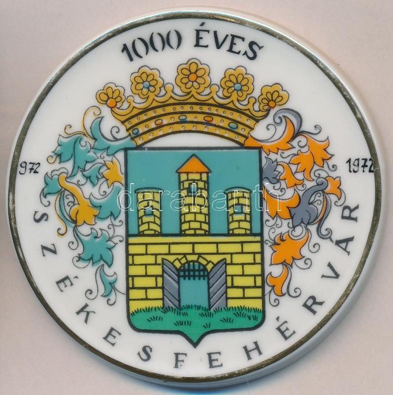 1972. "1000 éves Székesfehérvár 972-1972" jelzett "Holl... https://www.darabanth.com/de/253-Fernauktion/253.0/Numismatik/Ungarische-Edelmetall-Gedenkmunzen~200009/1972-1000-eves-Szekesfehervar-972-1972-jelzett-Hollohaza-porcelan-plakett-88mm-T2~II1231181