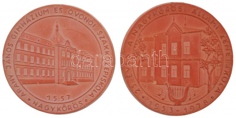 1978. "25 éves a Nagykőrösi Állami Zeneiskola 1953-1978" kerámai plakett (103mm) + DN "Arany János Gimnázium és Óvónői Szakközépiskola - Nagykőrös 1557" kerámia plakett (103mm) T:2 mindkettőn lyukak akasztáshoz