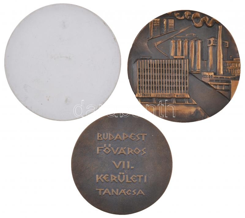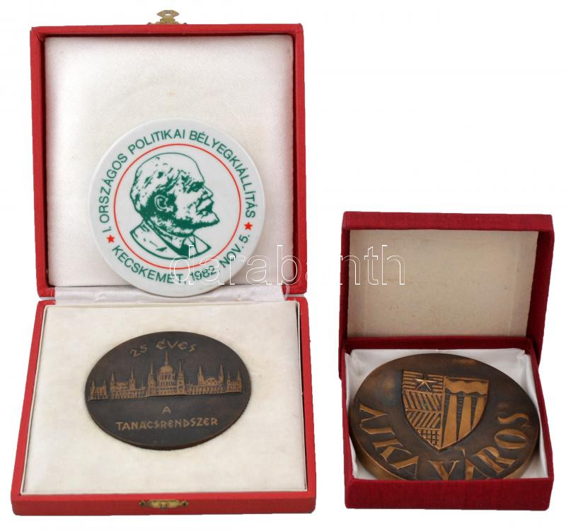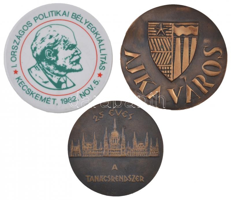 ~1980. "Ajka város" Br emlékérem eredeti tokban (95mm) + 1982. "I. Országos Politikai Bélyegkiállítás - Kecskemét, 1982. nov. 5." porcelán plakett (98mm) + Bognár György (1944-) DN "25 éves a Tanácsrendszer / Budapest Főváros VII. Kerületi Tanácsa" Br" plakett eredeti tokban (85mm) T:1-,2