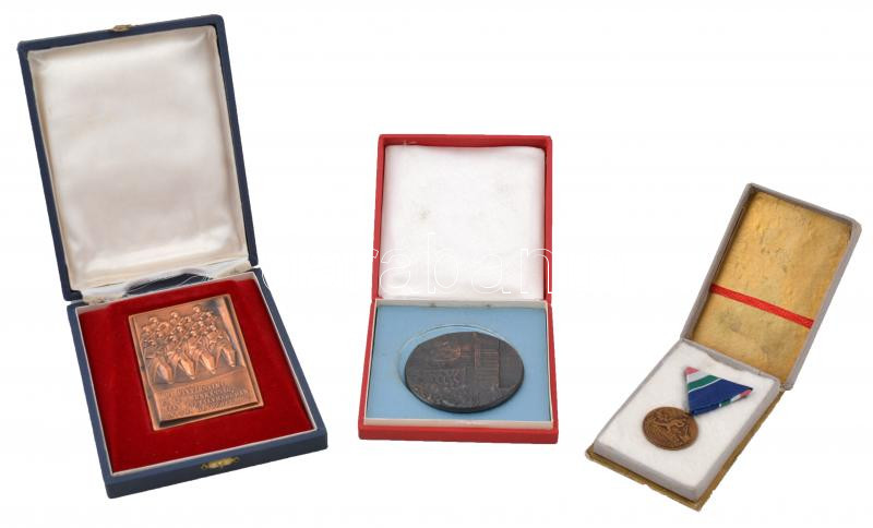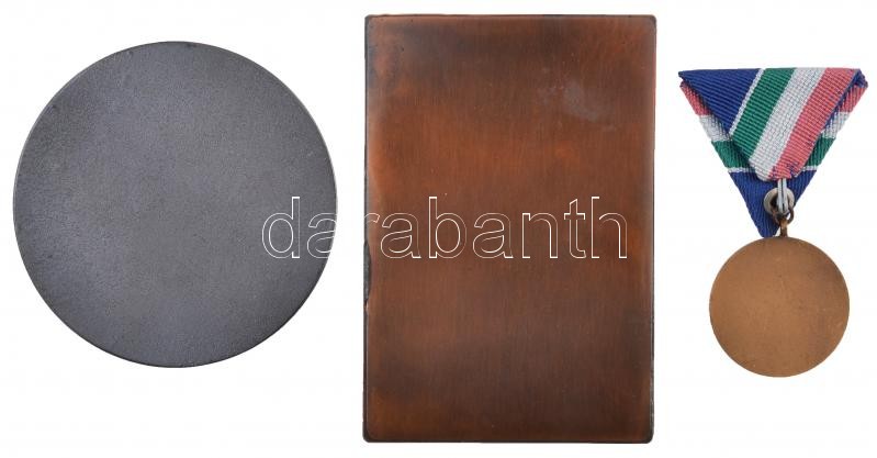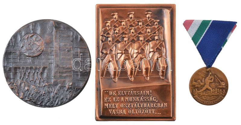 Kiss Nagy András (1930-1997) 1977. "De elvtársaim! Ez az a munkásság, mely osztályharcban vasba öltözött..." vörösréz emlékplakett eredeti dísztokban (105x72mm) + Br szocreál emlékplakett eredeti dísztokban (79,5mm) + 1965. "Árvízvédelemért Érem" patinázott Br kitüntetés mellszalaggal, dísztokban T:1,1-,2
