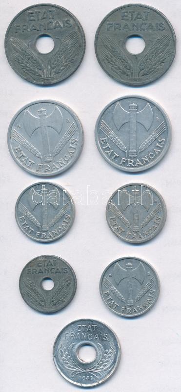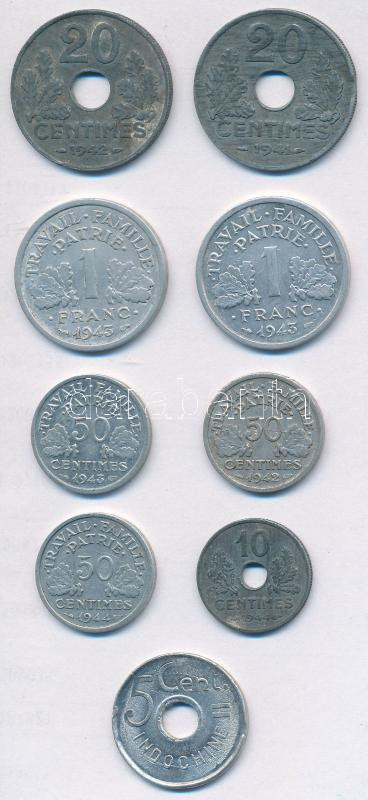 France / German occupation 1941. 20 Centimes Zn + 1942. 20 Centimes zn + 1944. 10 Centimes Zn + Vichy French State 1942-1944. 50 Centimes Al (3xdiff) + 1 Franc Al (2x) + French Indo-China / Vichy Government issue 1943A 5 Cents Al C:XF,VF