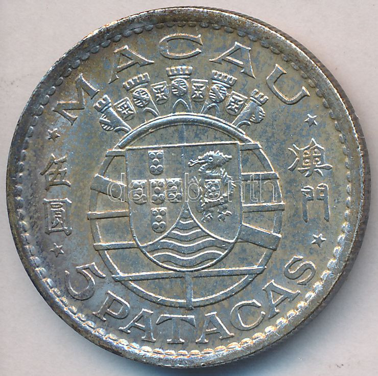Macao 1971. 5 Patacas Ag C:XF,VF https://www.darabanth.com/de/253-Fernauktion/253.0/Numismatik/Weltweit-Munzen~200012/Makao-1971-5P-Ag-T2-2---Macao-1971-5-Patacas-Ag-CXF-VF~II1228628