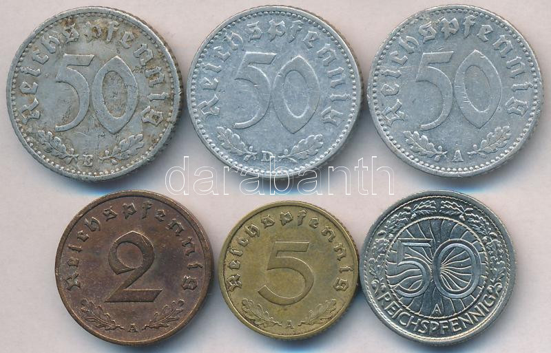 German Third Reich 1935A 50 Pfennig Al + 1935D 50 Pfennig Al + 1935E 50 Pfennig Al + 1937A 5 Pfennig Al-Br + 50 Pfennig Ni + 1940A 2 Pfennig Br C:XF,VF