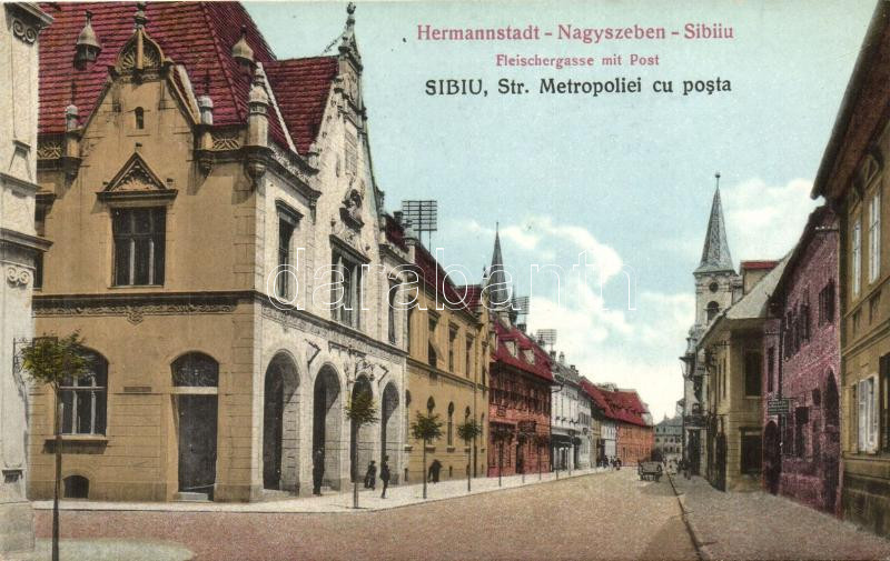 Nagyszeben, Hermannstadt, Sibiu; Hentes utca, Posta / Fleischergasse /... https://www.darabanth.com/de/253-Fernauktion/253.0/Topographische-Postkarten-und-Lose/Siebenburgen~6/Nagyszeben-Hermannstadt-Sibiu-Hentes-utca-Posta-Fleischergasse-street-post-office~II1225294