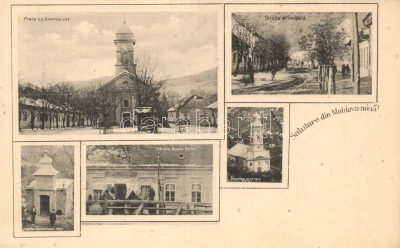 Újmoldova, Moldova Noua; Fő utca, Katolikus templom, temető kápolna, Nicolae Balea üzlete; kiadja Nicolae Balea / main street, churches, cemetery chapel, shop