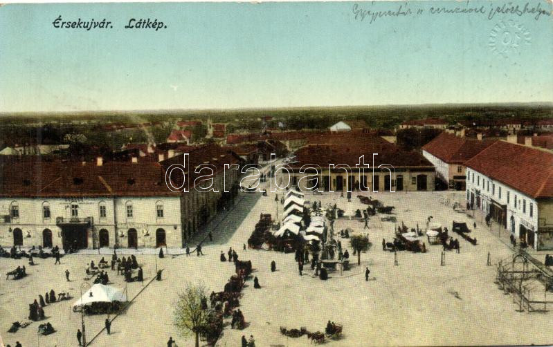 Beschreibung: Érsekújvár, Nové Zamky; látkép, piac, Arany Oroszlán szálloda / panorama view, market, hotel (EK)