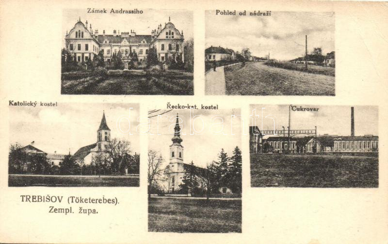 Beschreibung: Tőketerebes, Trebisov; Cukorgyár, Andrássy kastély, vasútállomás / sugar factory, castle, railway station (EB)