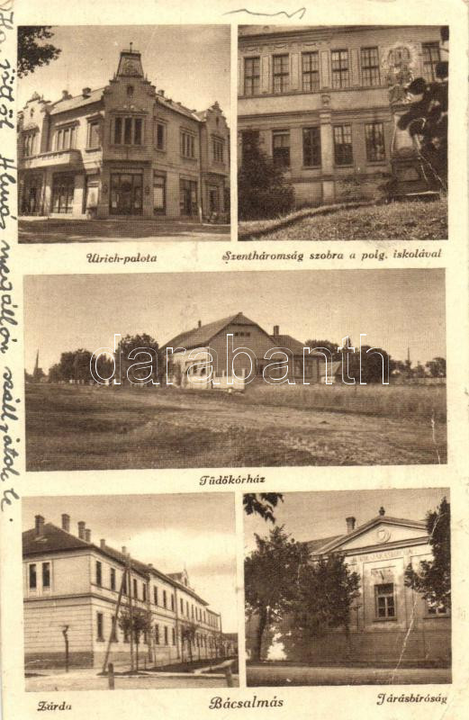 Beschreibung: Bácsalmás, Ulrich-palota, Szentháromság szobra a polgári iskolával, Tüdőkórház, Zárda, Járásbíróság (kis szakadás / small tear)