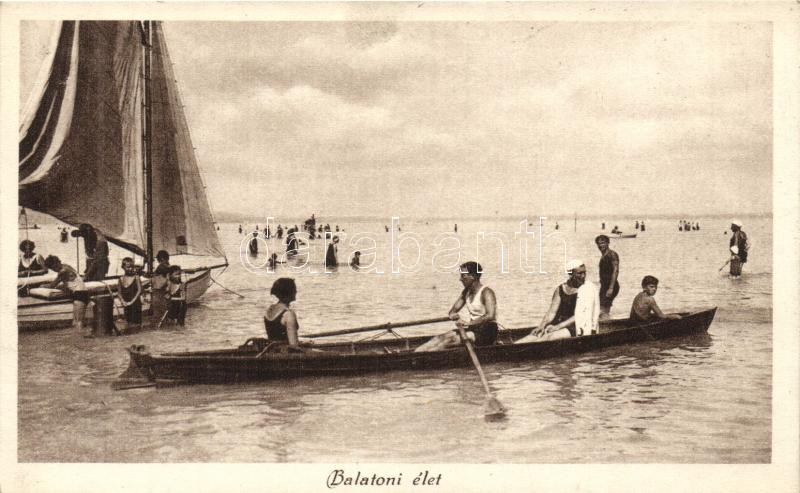 Beschreibung: Balatoni élet, evezőscsónak, vitorlás