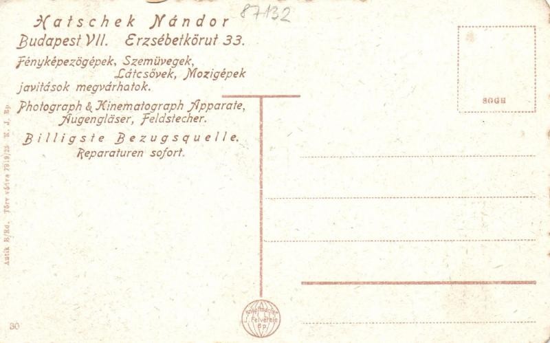 Beschreibung: Budapest II. Lukács fürdő, hátoldalon Hatschek Nándor fényképezőgép, szemüveg, látcső és mozigép javító reklámja (EK)