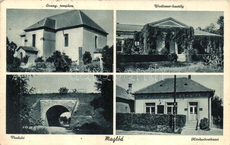 Beschreibung: Maglód, Evangélikus templom, Wodianer-kastély, viadukt, hitelszövetkezet (EK)