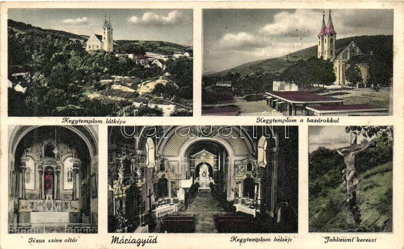 Beschreibung: Máriagyüd, Kegytemplom, bazárok, Jézus szíve oltár, Jubileumi kereszt, a templom belseje (EK)