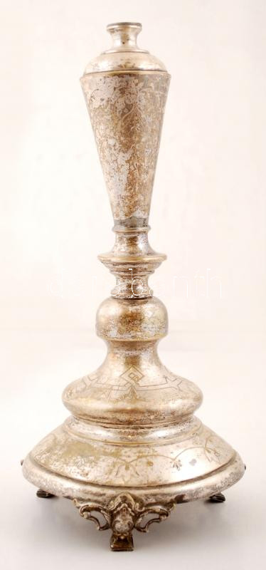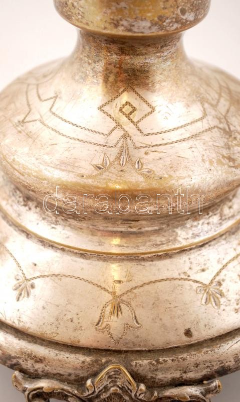 Beschreibung: Argentor ezüstözött, gazdagon díszített gyertyatartó, jelzett, kis görbüléssel, m: 30,5 cm